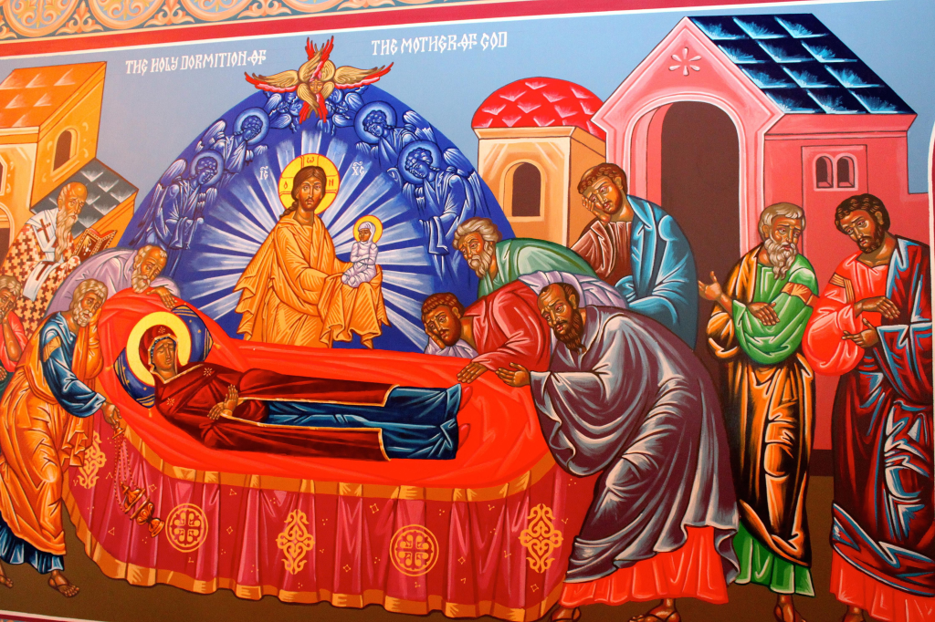 This feast of the Dormition, the defined dogma of the bodily assumption of the Virgin Mary into heaven, is therefore a really significant event. And by the way, the custom of bringing flowers to a funeral dates from the discovery of Mary’s empty tomb filled with flowers. Sending flowers to a funeral, putting flowers on the grave, is a sign that I believe in the resurrection of the dead, just as we proclaim in the Nicene Creed. Mary is our ultimate sign of our destiny, of our hope, of God’s promises being fulfilled. She prays for us perpetually – may we turn to her always. As Saint Ephrem the Syrian wrote in the Hail Holy Queen, may she turn her eyes of mercy towards us, and at the end of our lives, reveal to us the fruit of her womb, our Savior Jesus Christ.