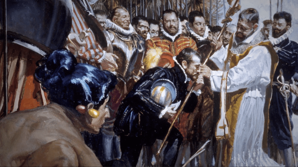 The first thanksgiving service in America of Europeans and Native Americans was in 1565, when the colony of Saint Augustine was founded in Florida. Rather than the normal procedure of planting the flag and claiming land in the name of the king that had been done for the previous 70 years, the Spanish governor Pedro Menéndez de Avilés planted a cross, which he kissed, and then claimed Florida in the name of God.