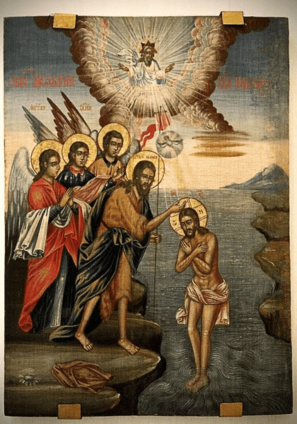 Secondly, it is a theo-phany. It is a manifestation of God, since, as the troparion makes clear, worship of the Trinity was revealed. Jesus steps into the Jordan River, and is revealed as the full Son of God. God the Father speaks, the Son is revealed, and the Holy Spirit descends like a dove, in the form of a dove.