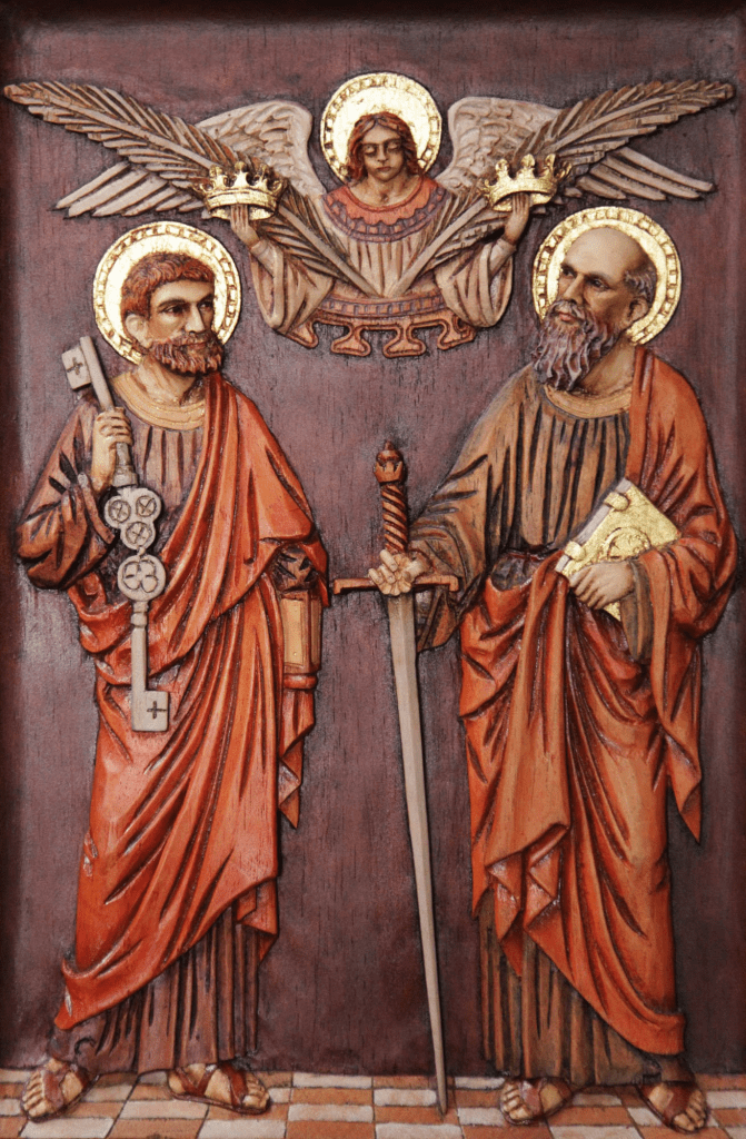 When they are shown together, Peter has the keys, given to him by Jesus as a sign of his stewardship over the Church on earth and Paul with a sword, but both hold books that represent their epistles. Paul’s theology is key to the Christian faith, Peter’s role as leader and guide literally provided a solid foundation for the early Church to build upon.