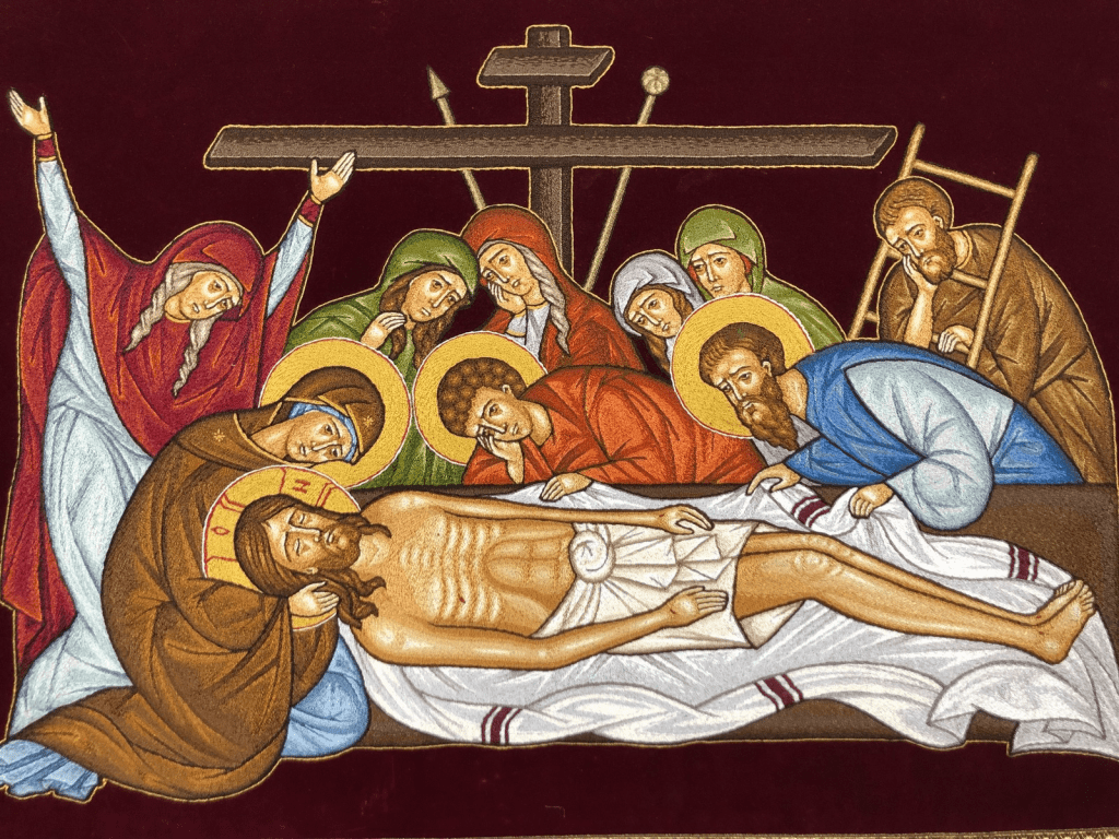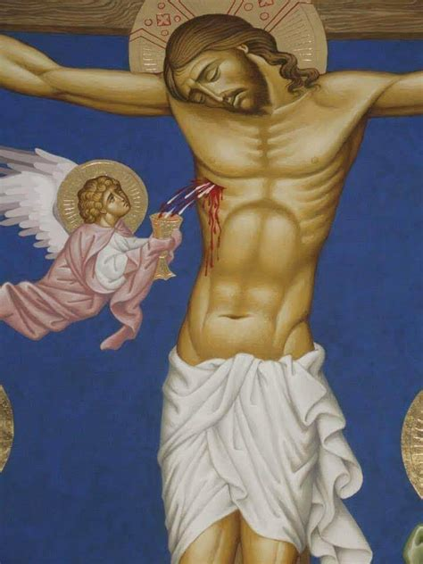 Here, John says that the water and blood gush, pour out. In one of the legends, it says that the centurion Cornelius was blind in one eye but the pouring water hits that eye with force and he is cured. It gushes from that dead sacred body – a sign of fulfillment of running water; the water equals Baptism; blood equals the Eucharist; his breathing of the spirit equals Chrismation / Confirmation – the traditional order of the three sacraments of initiation still preserved in all Eastern Churches and in the rite for adult converts in the Roman Church.