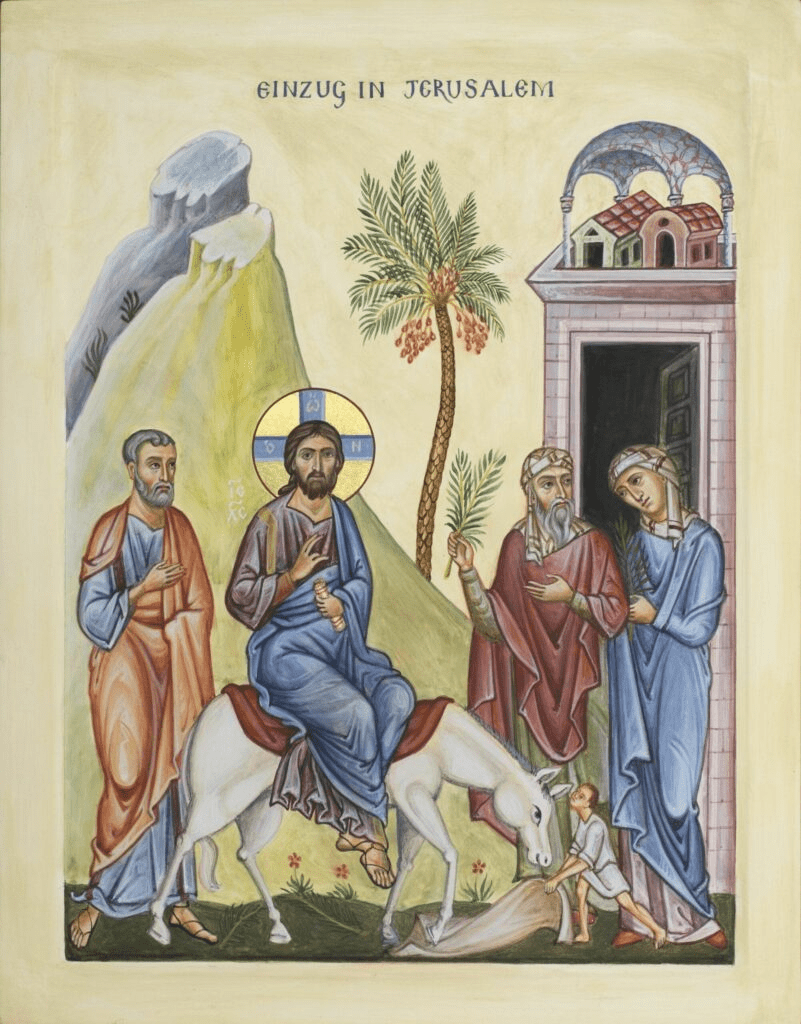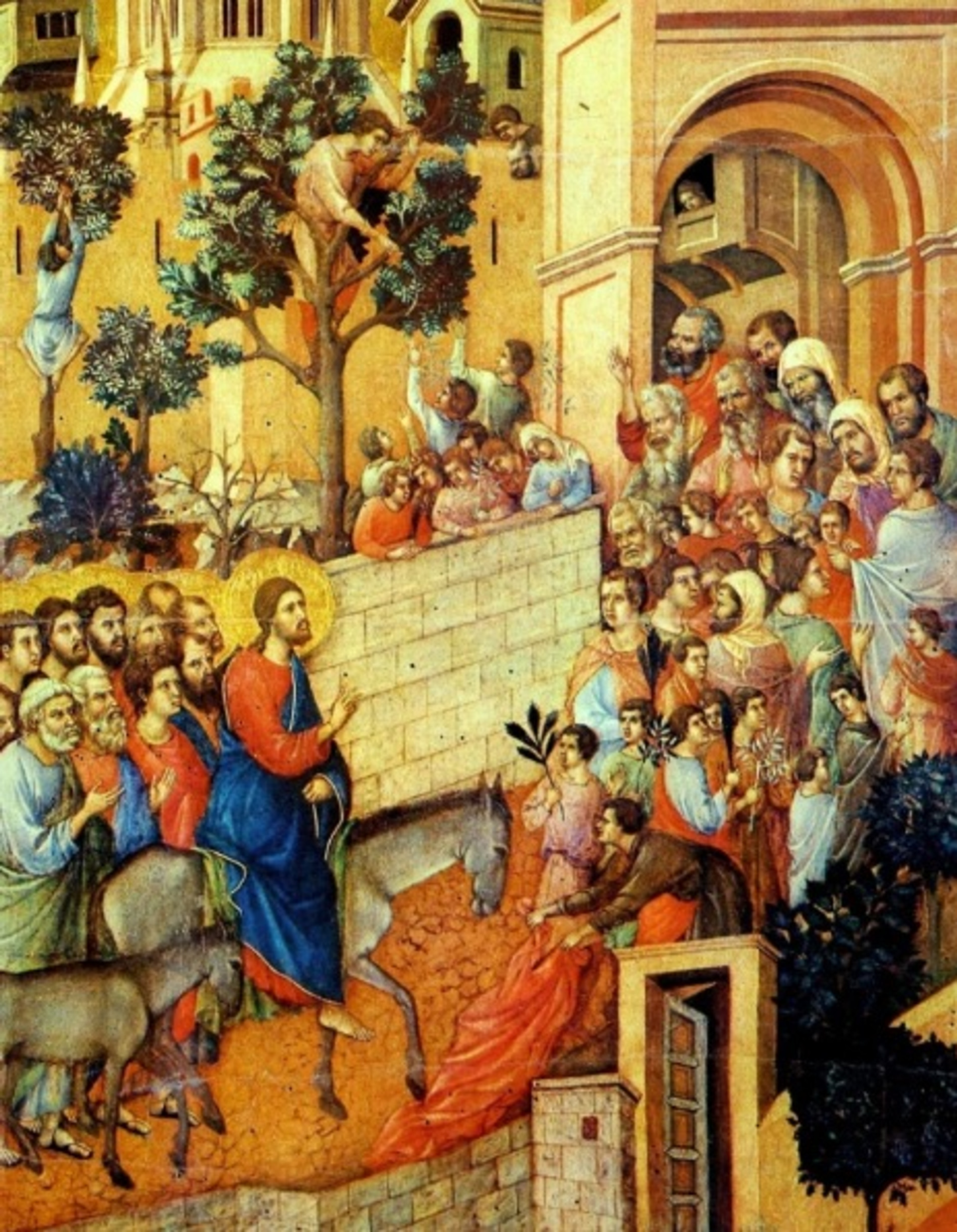 In ancient times, when a king rode into a city, it was usually with a show of power and wealth. Christ is both the rightful king of Israel and the gentle king. Jesus comes to greet his subjects, not with pomp and circumstance, but with all humility and meekness. At the very least, one would expect Jesus to ride a horse. But instead of coming on a mighty war horse, he rides a lowly beast of burden. He is riding a donkey, of all creatures—and a borrowed donkey, at that! He came in on a colt that has never been ridden by anyone. Try to get on any donkey or horse that has never been ridden before, and the animal will buck and toss off the person, because it is not used to the feeling of weight on its back. Instead, it is clear that our Lord simply gets on the animal and rides into the city, because like the ox and donkey in chapter 1 of Isaiah, that donkey recognizes its Master, its Creator, and simply goes along gently. Both the Lord and the donkey are gentle, and Jesus conquers with gentleness. The people acclaim him, the children praise him, and Jesus warns that even the stones of the hillside would cry out in triumph if the people had not done so.