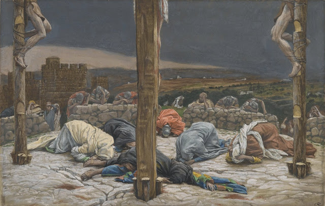 Our Blessed Lady and the teenager John, the Beloved Disciple, stand near the Cross. Mary becomes the Mother of the Church, John becomes the brother of Jesus, in that famous verse of the Last Words, “Behold your mother, behold your son.” The Church is rooted in these two and the holy women standing with them as being founded on their loyalty, their discipleship, their dedication to Jesus even at the worst moment possible. The Good Thief achieves salvation by acknowledging his guilt, by stating the innocence of Jesus from the false charges, and by proclaiming his confidence in the ability of the Lord to save his soul from perdition, and Jesus assures him, “today thou shalt be with me in paradise.” The sun had disappeared at noon, in fulfillment of the writings of the prophets Joel and Amos and Zechariah who predicted darkness and despair at midday, and the whole crowd of Jews and Romans was struck with fear and anxiety, but Jesus never condemned those who put him on the cross that day. Rather he said, “Father, forgive them.”